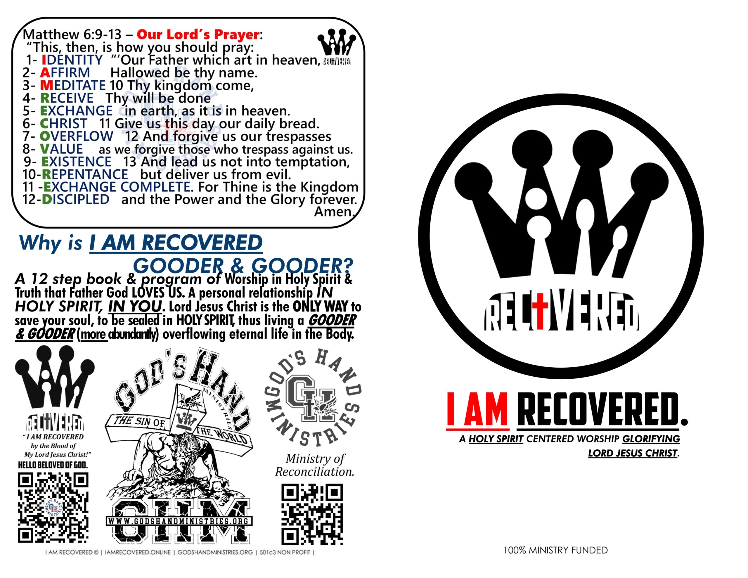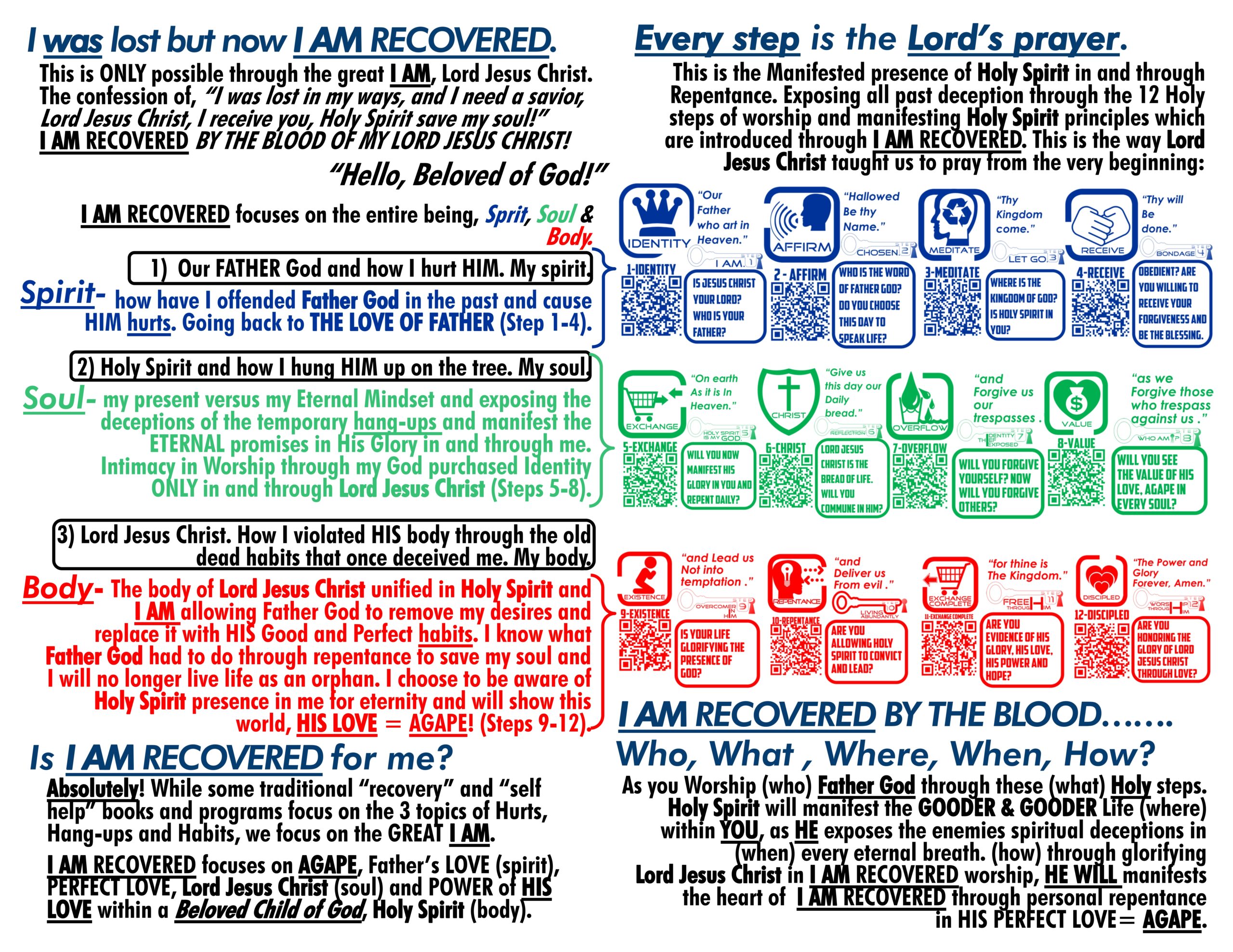 I AM RECOVERED has been for over 2000 years. By HIS Grace alone, Lord Jesus Christ through Holy Spirit Anointing has allowed us, God’s Hand Ministries, HIS Ministry of Recociliation to Observe Love, use Wisdom in Love, Discern what is of HIM and what is not, Retrieve every Step and Principle from the Holy Bible, and document HIS Glory, HIS questions, HIS steps, HIS principles to manifest I AM RECOVERED = AGAPE!